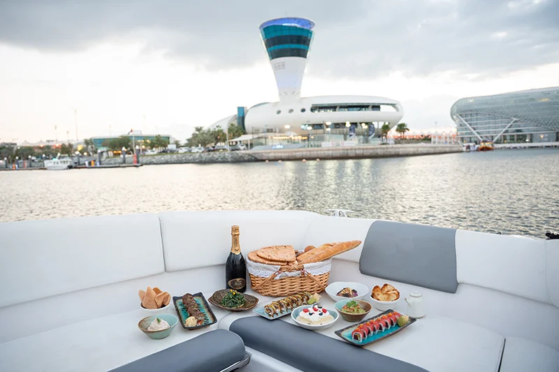إذا كنتما تفضلان البحر على الطاولات التقليدية، يمكن حجز قارب خاص لمدة ساعة في مرسى ياس.