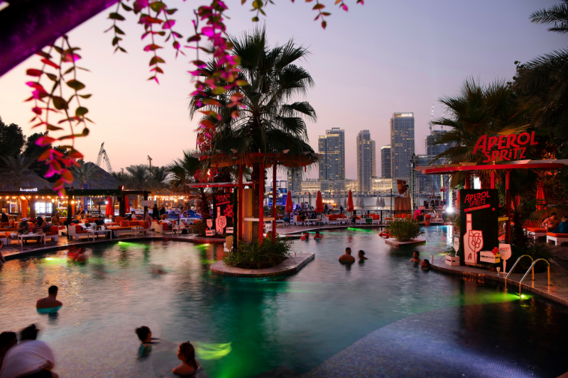 مسبح على الشاطئ بأجواء استوائية، موسيقى DJ مباشرة، ومباريات تُعرض على الشاشات من داخل المسبح.